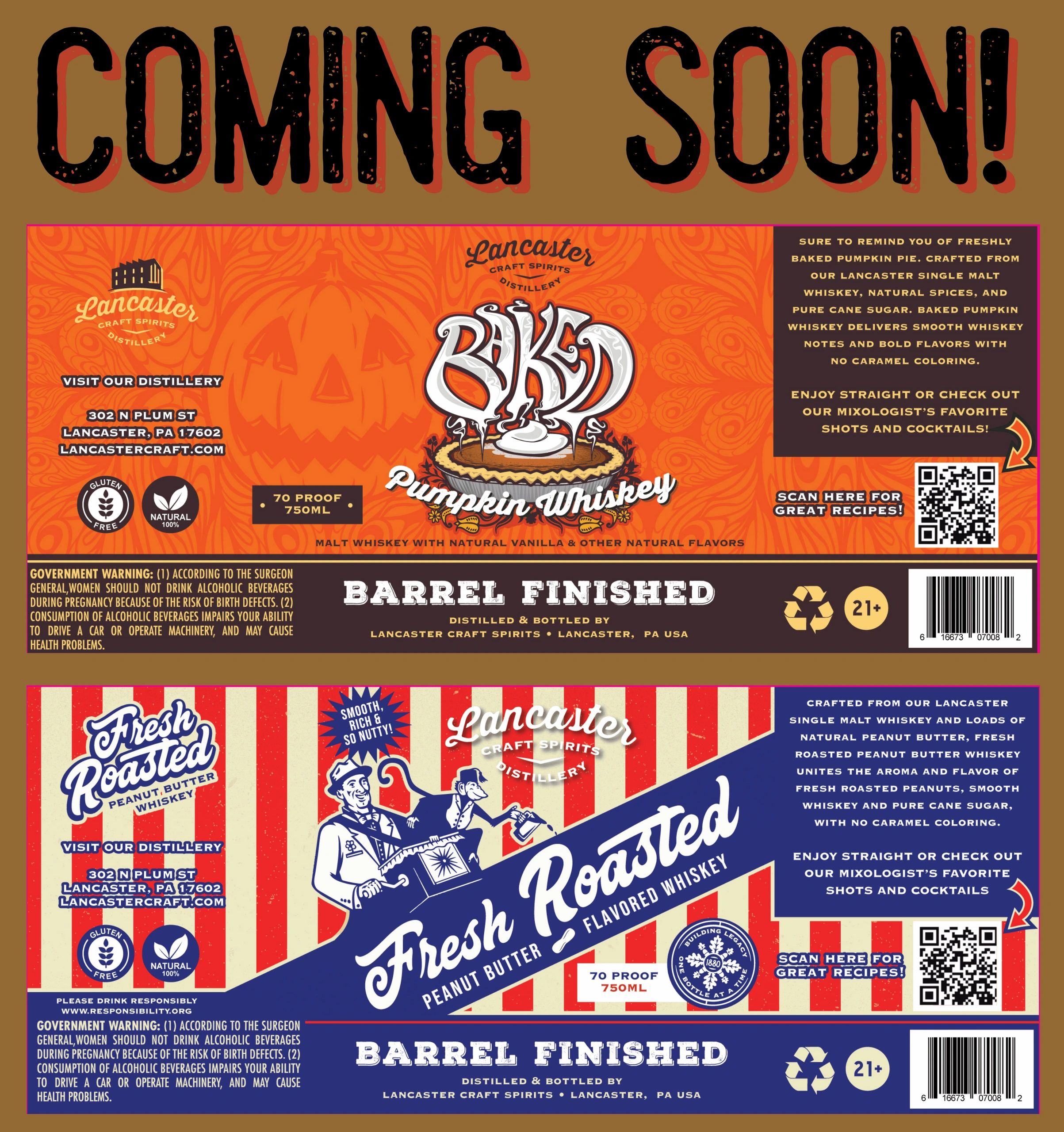 Baked Pumpkin and Fresh Roasted Peanut Butter Whiskeys are approaching the final stages of their finishing in our ex-whiskey barrels, and nearly ready for bottling.
